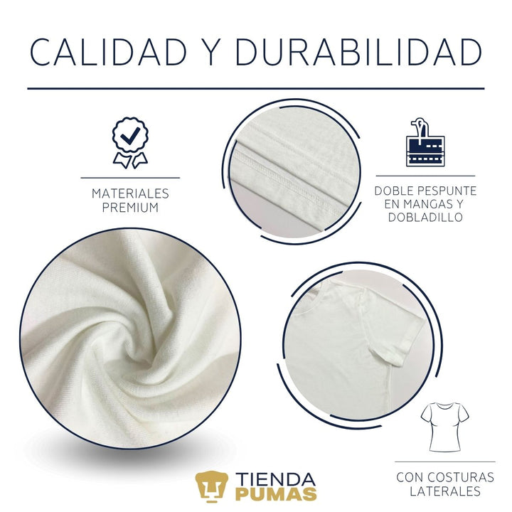 - ORIGINALIDAD Y SOSTENIBILIDAD: Playera de Mujer manga corta, Producto Oficial con un diseño original de Pumas UNAM impreso con tecnología DTG (directo a la prenda) tacto cero. Se utilizan tintas ecológicas sin contaminantes que se adhieren a las fibras de la ropa, garantizando calidad, colores vivos e imagen de larga duración en la camiseta sin comprometer el planeta. La playera cuenta además con etiqueta y holograma que la garantiza como producto 100% original de Club Universidad Nacional