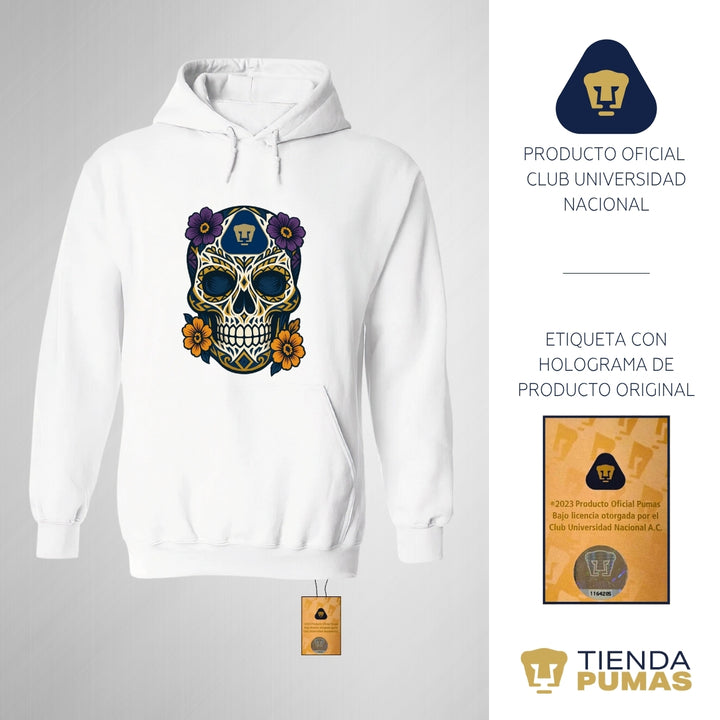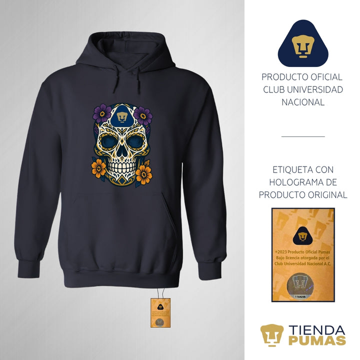 Sudadera hoodie de adulto con gorro o capucha y bolsillo frontal canguro, para hombre nueva pumas UNAM oficial, diseño Calaveras original impreso con tecnología DTG (directo a la prenda) tacto cero, uso casual o deportiva, 50% algodón y 50% poliéster fleece pre encogido, estructura tubular con ajuste clásico. Colores de sudadera: Azul Marino, Blanco, Negro y Gris.