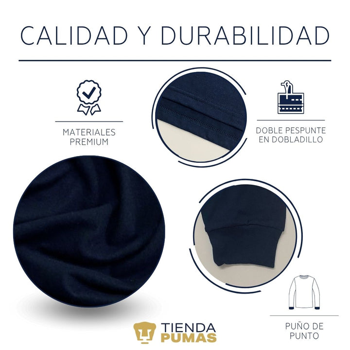 - ORIGINALIDAD Y SOSTENIBILIDAD: Playera de adulto de manga larga, Producto Oficial con un diseño original de Pumas UNAM impreso con tecnología DTG (directo a la prenda) tacto cero. Se utilizan tintas ecológicas sin contaminantes que se adhieren a las fibras de la ropa, garantizando calidad, colores vivos e imagen de larga duración en la camiseta sin comprometer el planeta. La playera cuenta además con etiqueta y holograma que garantiza un producto 100% original de Pumas UNAM.