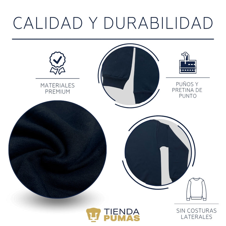 - ORIGINALIDAD Y SOSTENIBILIDAD: Sudadera de adulto cuello redondo sin gorro, Producto Oficial con un diseño original de Pumas UNAM impreso con tecnología DTG (directo a la prenda) tacto cero. Se utilizan tintas ecológicas sin contaminantes que se adhieren a las fibras de la ropa, garantizando calidad, colores vivos e imagen de larga duración en la sudadera sin comprometer el planeta. La sudadera cuenta con etiqueta y holograma que garantiza un producto 100% original de Pumas UNAM.