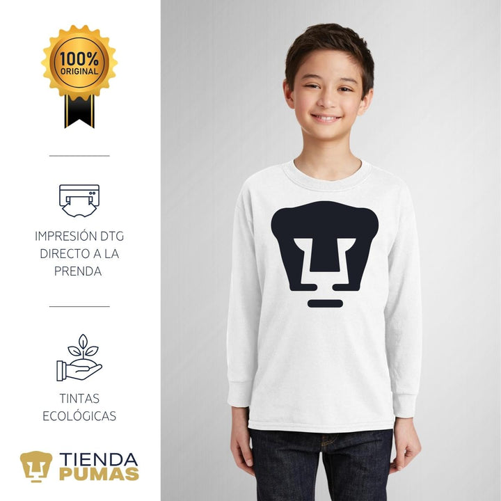 - ORIGINALIDAD Y SOSTENIBILIDAD: Playera infantil de manga larga. Producto Oficial con un diseño original de Pumas UNAM impreso con tecnología DTG (directo a la prenda) tacto cero. Se utilizan tintas ecológicas sin contaminantes que se adhieren a las fibras de la ropa, garantizando calidad, colores vivos e imagen de larga duración en la camiseta sin comprometer el planeta. La playera cuenta además con etiqueta y holograma que garantiza un producto 100% original de Pumas UNAM.