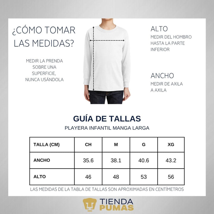 - ORIGINALIDAD Y SOSTENIBILIDAD: Playera infantil de manga larga. Producto Oficial con un diseño original de Pumas UNAM impreso con tecnología DTG (directo a la prenda) tacto cero. Se utilizan tintas ecológicas sin contaminantes que se adhieren a las fibras de la ropa, garantizando calidad, colores vivos e imagen de larga duración en la camiseta sin comprometer el planeta. La playera cuenta además con etiqueta y holograma que garantiza un producto 100% original de Pumas UNAM.