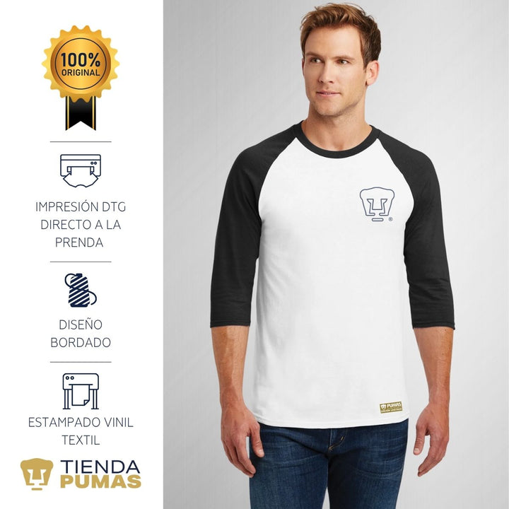 - ORIGINALIDAD Y SOSTENIBILIDAD: Playera de hombre raglán manga 3/4. Producto Oficial con un diseño original de Pumas UNAM impreso con tecnología DTG (directo a la prenda) tacto cero, estampado vinil textil y bordado. La playera cuenta además con etiqueta y holograma que garantiza un producto 100% original de Pumas UNAM.