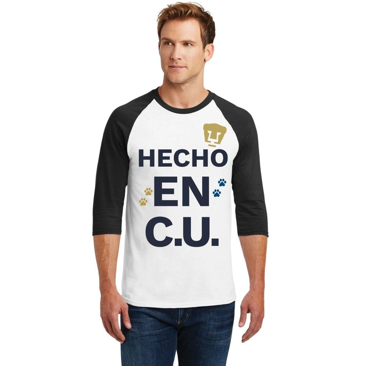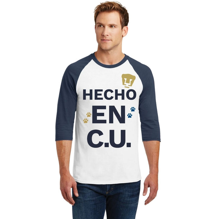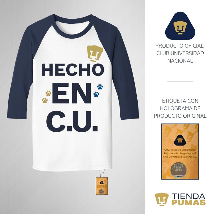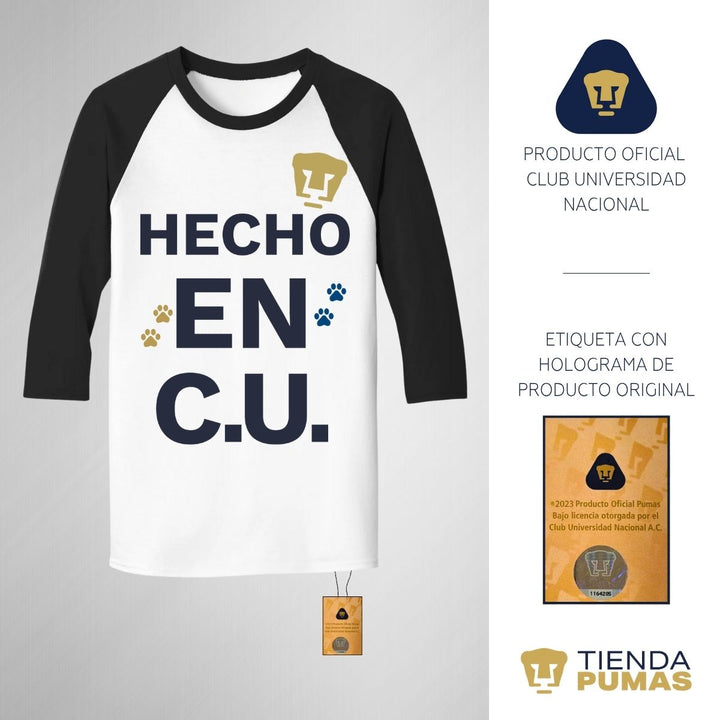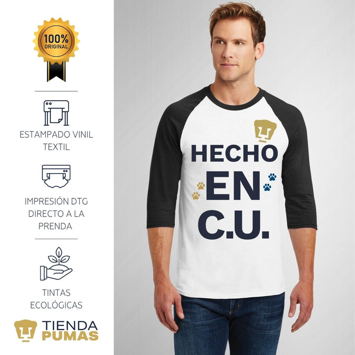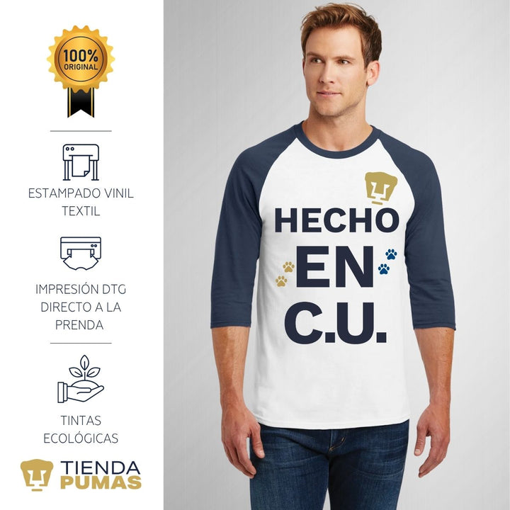 Playera de adulto raglán manga 3/4, cuello redondo para hombre nueva, Pumas UNAM oficial, diseño Hecho en CU original impreso con tecnología DTG (directo a la prenda) tacto cero y estampado vinil textil, uso casual o deportiva, 100% algodón chifón pre encogido, estructura tubular sin costuras laterales. Colores de camiseta para caballero: Blanco-Marino, Blanco-Negro.