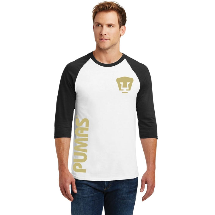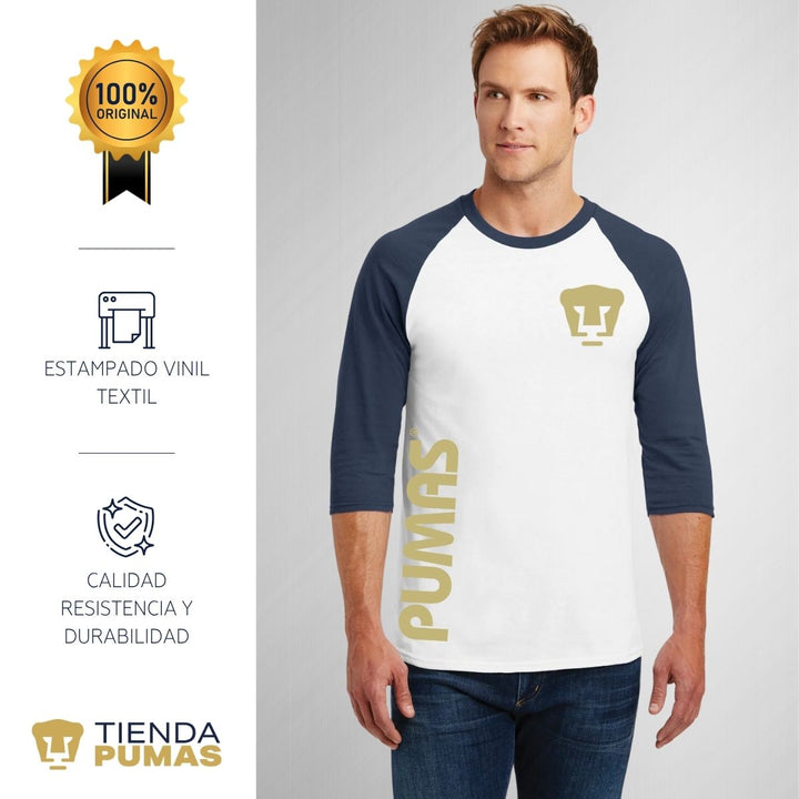 - ORIGINALIDAD Y SOSTENIBILIDAD: Playera de hombre raglán manga 3/4. Producto Oficial con un diseño original de Pumas UNAM estampado en vinil textil. La playera cuenta además con etiqueta y holograma que garantiza un producto 100% original de Pumas UNAM.