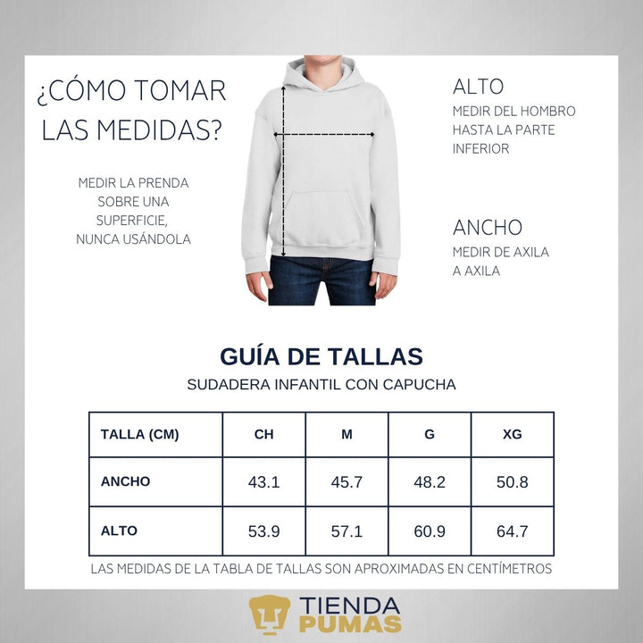 - ORIGINALIDAD Y SOSTENIBILIDAD: Sudadera infantil con capucha. Producto Oficial con un diseño original de Pumas UNAM impreso con tecnología DTG (directo a la prenda) tacto cero. Se utilizan tintas ecológicas sin contaminantes que se adhieren a las fibras de la ropa, garantizando calidad, colores vivos e imagen de larga duración en la sudadera sin comprometer el planeta. La sudadera cuenta con etiqueta y holograma que garantiza un producto 100% original de Pumas UNAM.