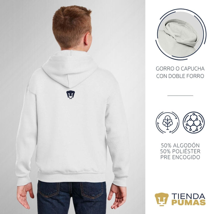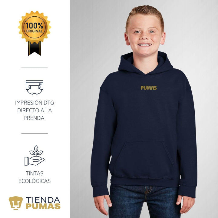 - ORIGINALIDAD Y SOSTENIBILIDAD: Sudadera infantil con capucha. Producto Oficial con un diseño original de Pumas UNAM impreso con tecnología DTG (directo a la prenda) tacto cero. Se utilizan tintas ecológicas sin contaminantes que se adhieren a las fibras de la ropa, garantizando calidad, colores vivos e imagen de larga duración en la sudadera sin comprometer el planeta. La sudadera cuenta con etiqueta y holograma que garantiza un producto 100% original de Pumas UNAM.