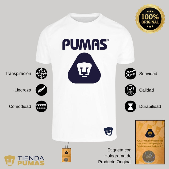 - ORIGINALIDAD Y SOSTENIBILIDAD: Playera transpirable de hombre manga corta, Producto Oficial con diseño original de Pumas UNAM impreso con tecnología DTG (directo a la prenda) tacto cero. Se utilizan tintas ecológicas sin contaminantes que se adhieren a las fibras de la ropa, garantizando calidad, colores vivos e imagen de larga duración en la camiseta sin comprometer el planeta. La playera cuenta además con etiqueta y holograma que garantiza un producto 100% original de Pumas UNAM.