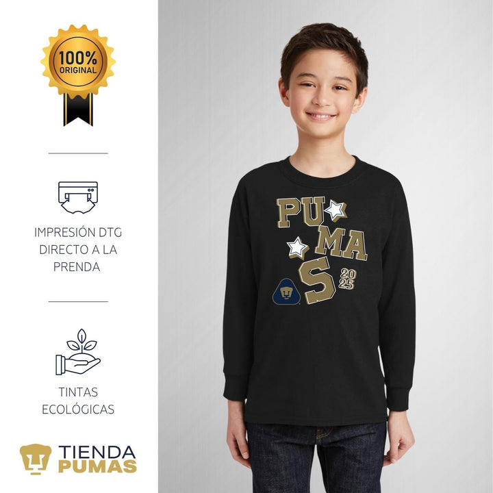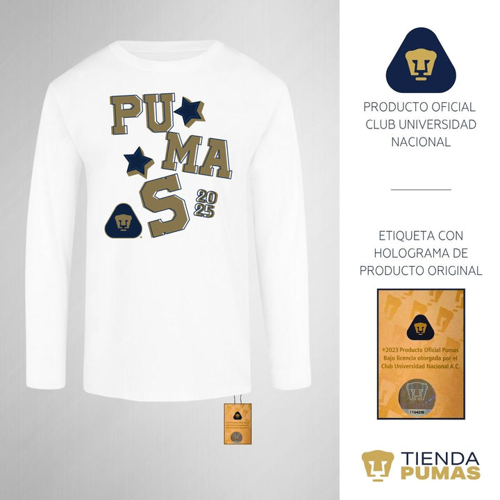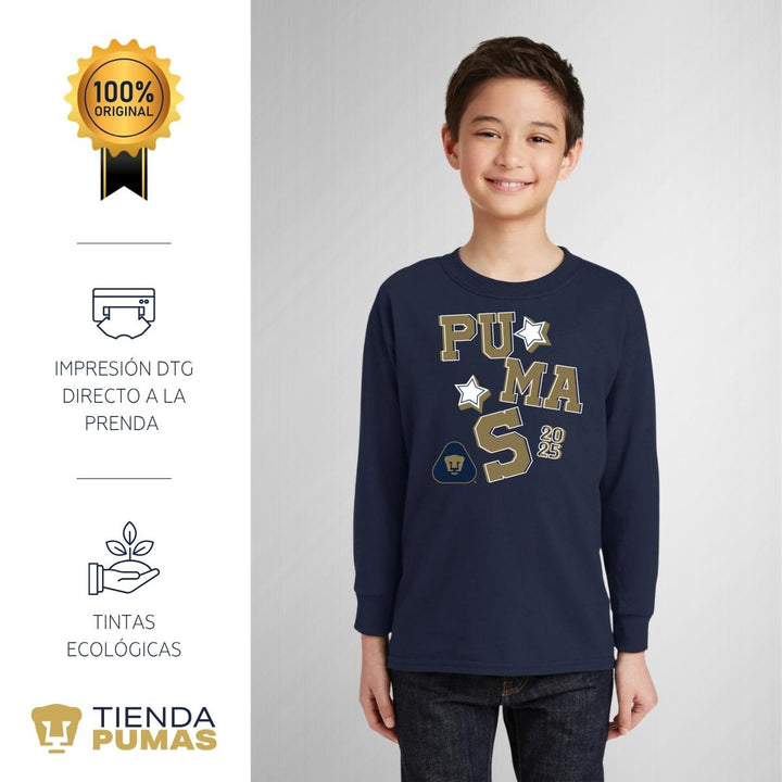 - ORIGINALIDAD Y SOSTENIBILIDAD: Playera infantil de manga larga. Producto Oficial con un diseño original de Pumas UNAM impreso con tecnología DTG (directo a la prenda) tacto cero. Se utilizan tintas ecológicas sin contaminantes que se adhieren a las fibras de la ropa, garantizando calidad, colores vivos e imagen de larga duración en la camiseta sin comprometer el planeta. La playera cuenta además con etiqueta y holograma que garantiza un producto 100% original de Pumas UNAM.