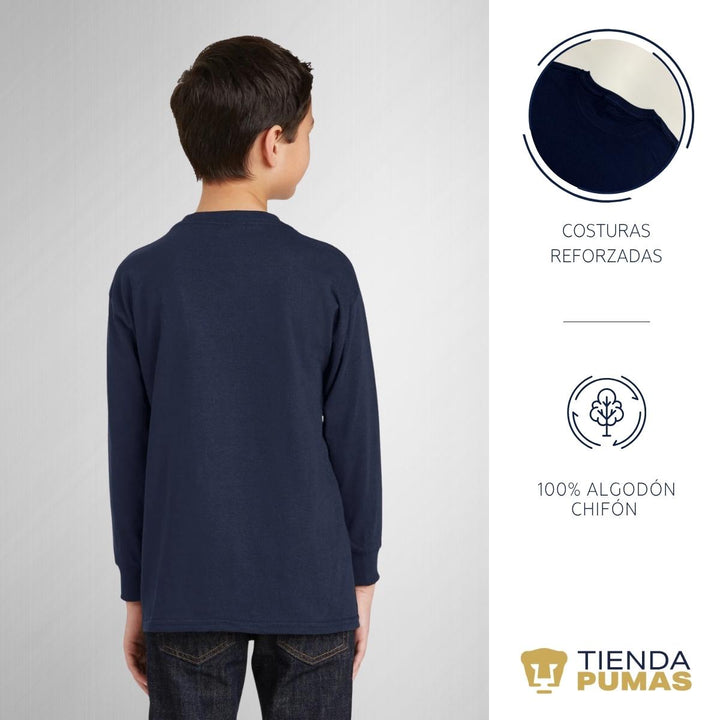 - ORIGINALIDAD Y SOSTENIBILIDAD: Playera infantil de manga larga. Producto Oficial con un diseño original de Pumas UNAM impreso con tecnología DTG (directo a la prenda) tacto cero. Se utilizan tintas ecológicas sin contaminantes que se adhieren a las fibras de la ropa, garantizando calidad, colores vivos e imagen de larga duración en la camiseta sin comprometer el planeta. La playera cuenta además con etiqueta y holograma que garantiza un producto 100% original de Pumas UNAM.