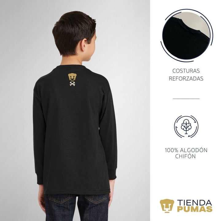 - ORIGINALIDAD: Playera infantil de manga larga. Producto Oficial con un diseño original de Pumas UNAM impreso con tecnología DTG (directo a la prenda) tacto cero, estampado vinil textil y bordado. La playera cuenta además con Etiqueta y holograma que garantiza un producto 100% original de Pumas UNAM.