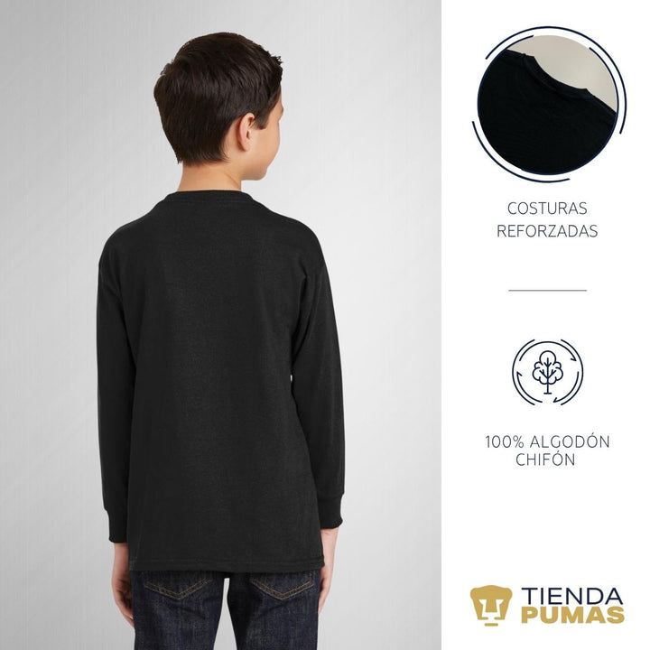 - ORIGINALIDAD Y SOSTENIBILIDAD: Playera infantil de manga larga. Producto Oficial con un diseño original de Pumas UNAM impreso con tecnología DTG (directo a la prenda) tacto cero. Se utilizan tintas ecológicas sin contaminantes que se adhieren a las fibras de la ropa, garantizando calidad, colores vivos e imagen de larga duración en la camiseta sin comprometer el planeta. La playera cuenta además con etiqueta y holograma que garantiza un producto 100% original de Pumas UNAM.
