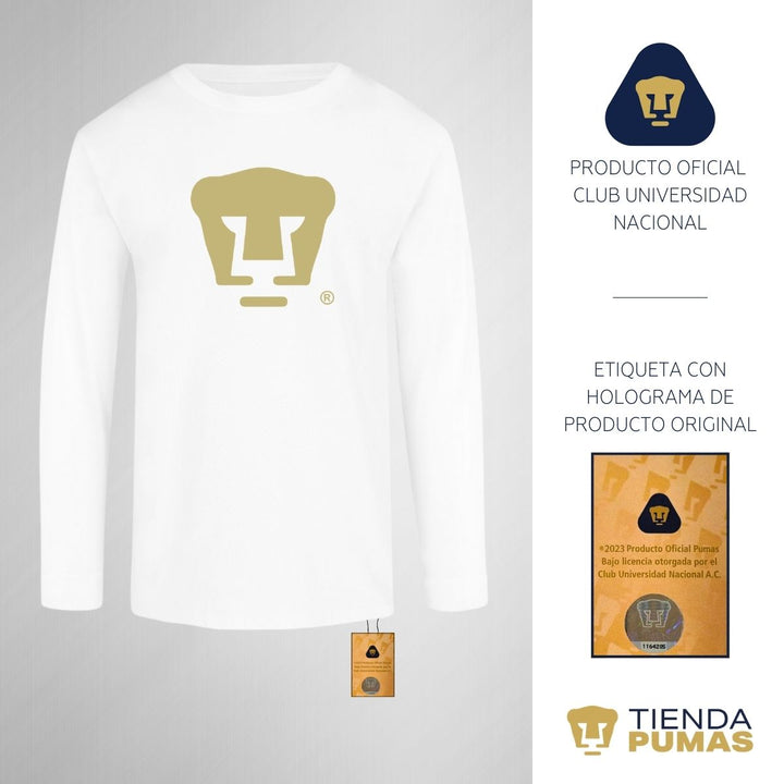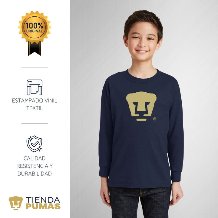 - ORIGINALIDAD: Playera infantil de manga larga. Producto Oficial con un diseño original de Pumas UNAM estampado en vinil textil. La playera cuenta además con etiqueta y holograma que garantiza un producto 100% original de Pumas UNAM.