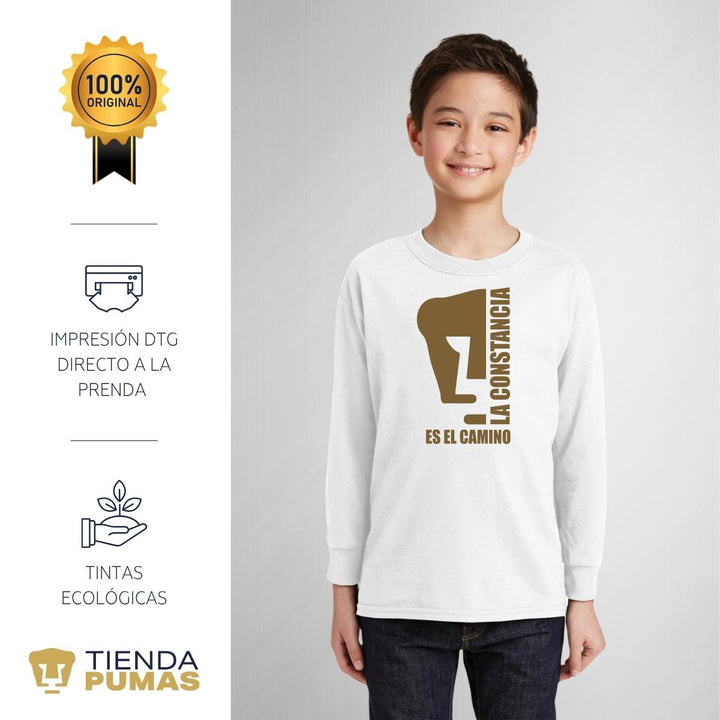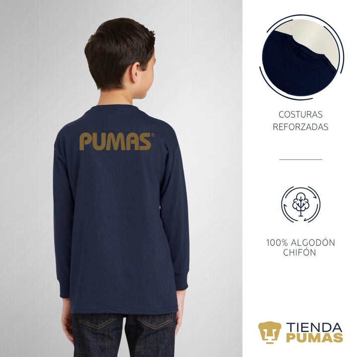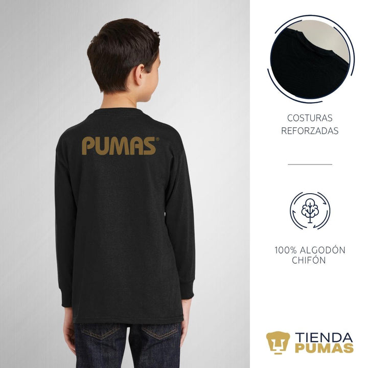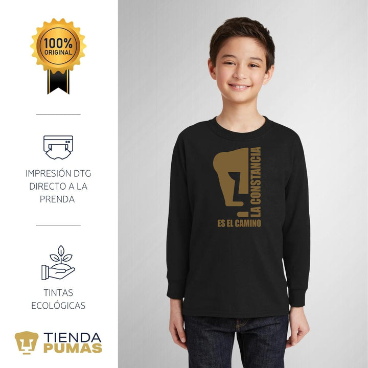 - ORIGINALIDAD Y SOSTENIBILIDAD: Playera infantil de manga larga. Producto Oficial con un diseño original de Pumas UNAM impreso con tecnología DTG (directo a la prenda) tacto cero. Se utilizan tintas ecológicas sin contaminantes que se adhieren a las fibras de la ropa, garantizando calidad, colores vivos e imagen de larga duración en la camiseta sin comprometer el planeta. La playera cuenta además con etiqueta y holograma que garantiza un producto 100% original de Pumas UNAM.