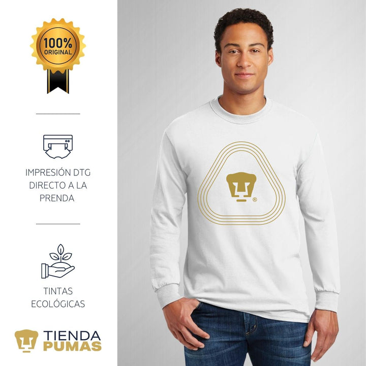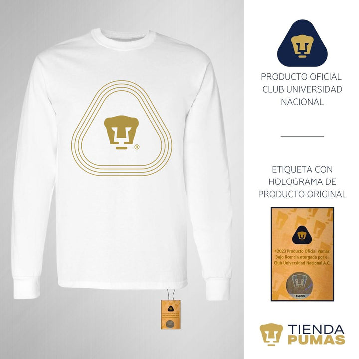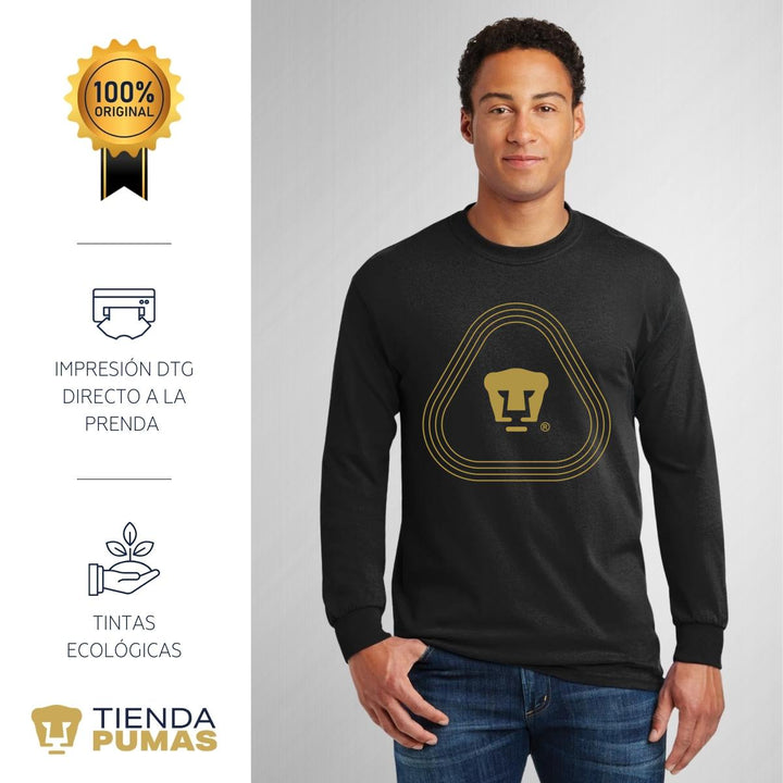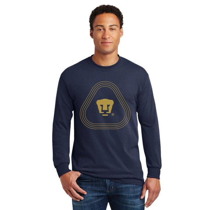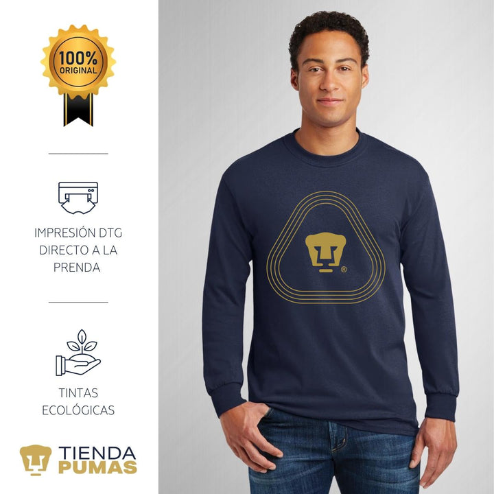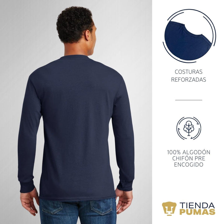 Playera manga larga Pumas UNAM oficial de hombre modelo OD77350 Logo Líneas color blanco, negro y azul, material algodón.