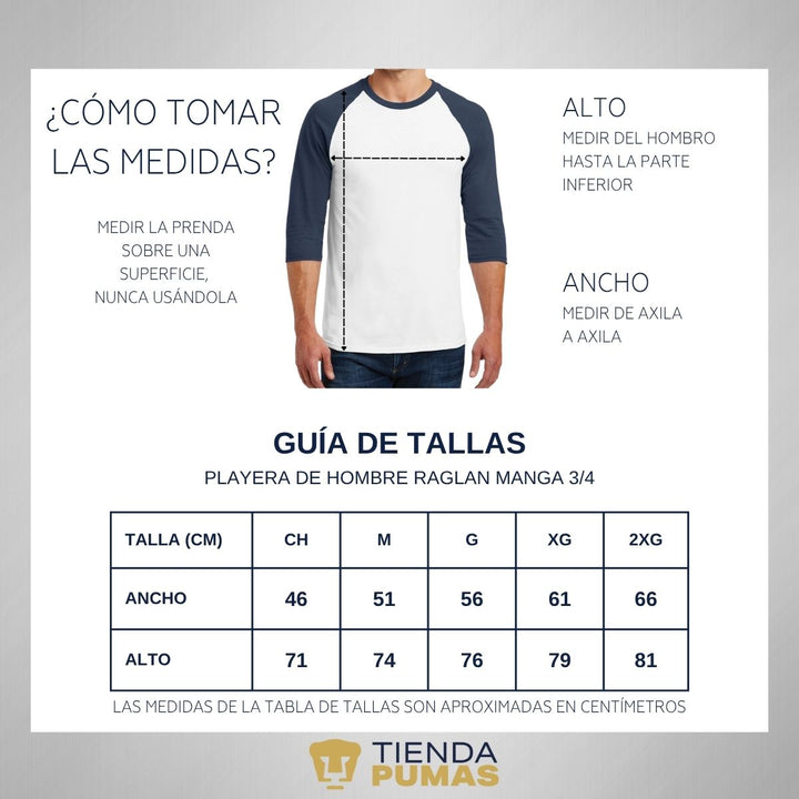 - ORIGINALIDAD Y SOSTENIBILIDAD: Playera de hombre raglán manga 3/4. Producto Oficial con un diseño original de Pumas UNAM impreso con tecnología DTG (directo a la prenda) tacto cero. Se utilizan tintas ecológicas sin contaminantes que se adhieren a las fibras de la ropa, garantizando calidad, colores vivos e imagen de larga duración en la camiseta sin comprometer el planeta. La playera cuenta además con etiqueta y holograma que garantiza un producto 100% original de Pumas UNAM.