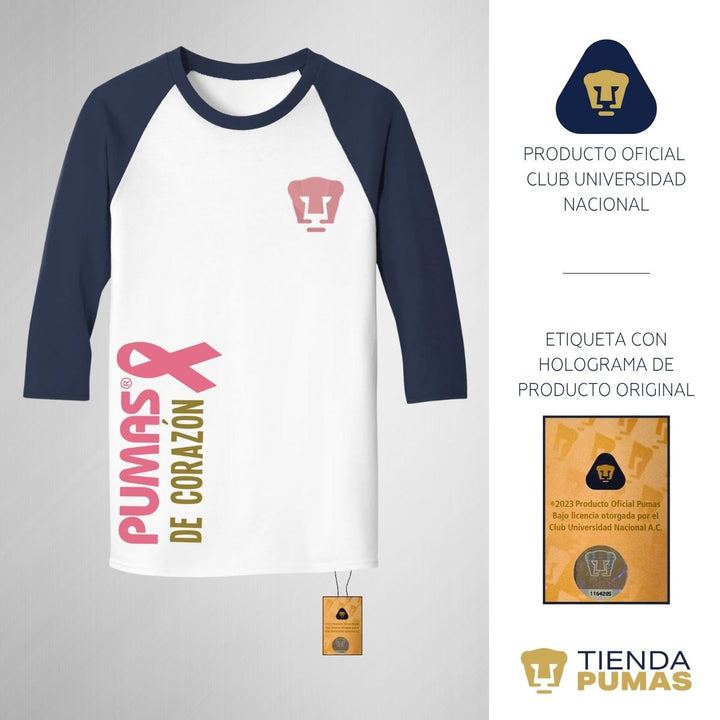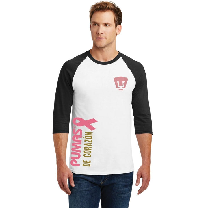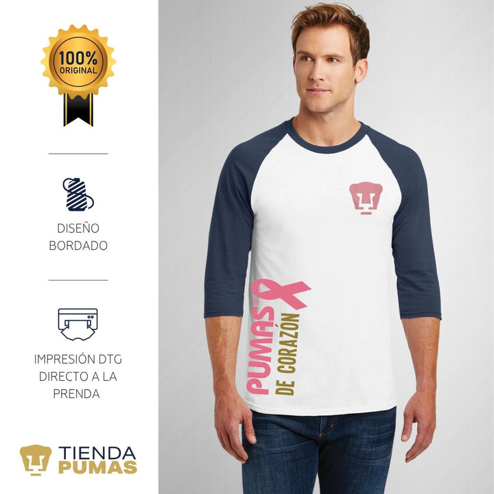 Playera Raglán Manga 3/4 Hombre Pumas UNAM De corazón logo rosa