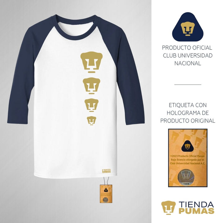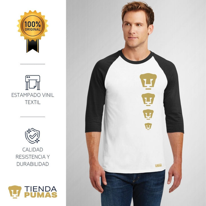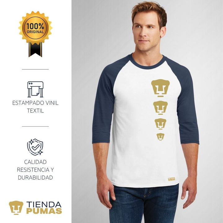 - ORIGINALIDAD Y SOSTENIBILIDAD: Playera de hombre raglán manga 3/4. Producto Oficial con un diseño original de Pumas UNAM estampado en vinil textil. La playera cuenta además con etiqueta y holograma que garantiza un producto 100% original de Pumas UNAM.