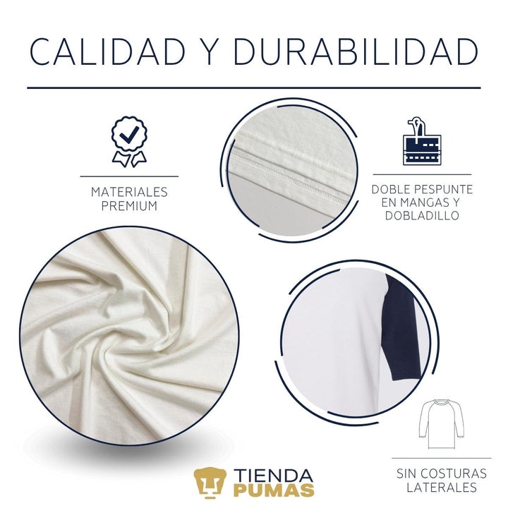 - ORIGINALIDAD Y SOSTENIBILIDAD: Playera de hombre raglán manga 3/4. Producto Oficial con un diseño original de Pumas UNAM impreso con tecnología DTG (directo a la prenda) tacto cero. Se utilizan tintas ecológicas sin contaminantes que se adhieren a las fibras de la ropa, garantizando calidad, colores vivos e imagen de larga duración en la camiseta sin comprometer el planeta. La playera cuenta además con etiqueta y holograma que garantiza un producto 100% original de Pumas UNAM.