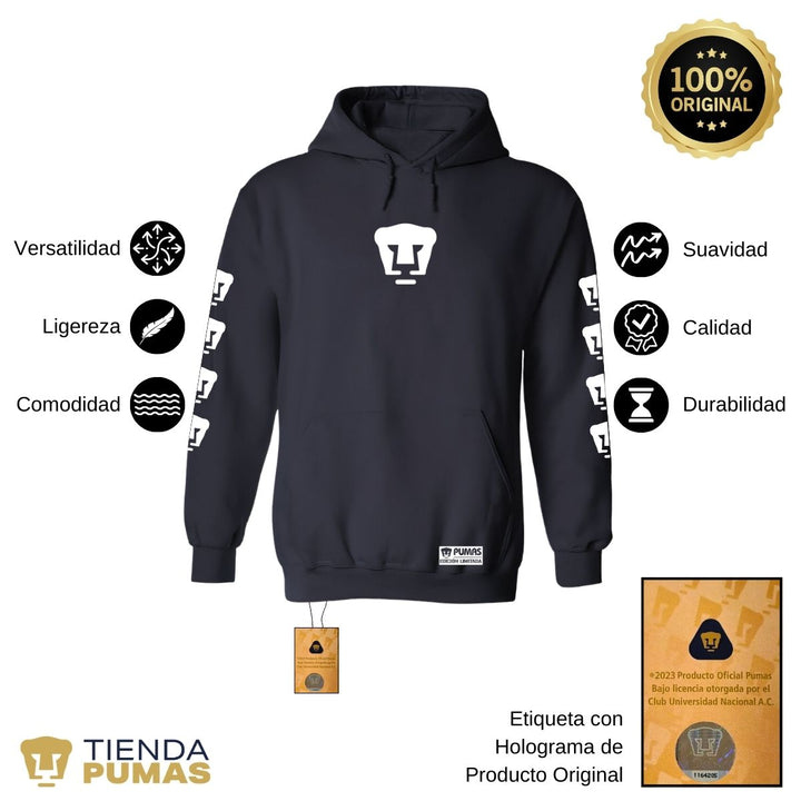 - ORIGINALIDAD: Sudadera de adulto con capucha, Producto Oficial con un diseño original de Pumas UNAM estampado vinil textil. La sudadera cuenta además con etiqueta y holograma que garantiza un producto 100% original de Pumas UNAM.