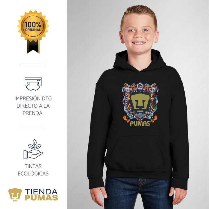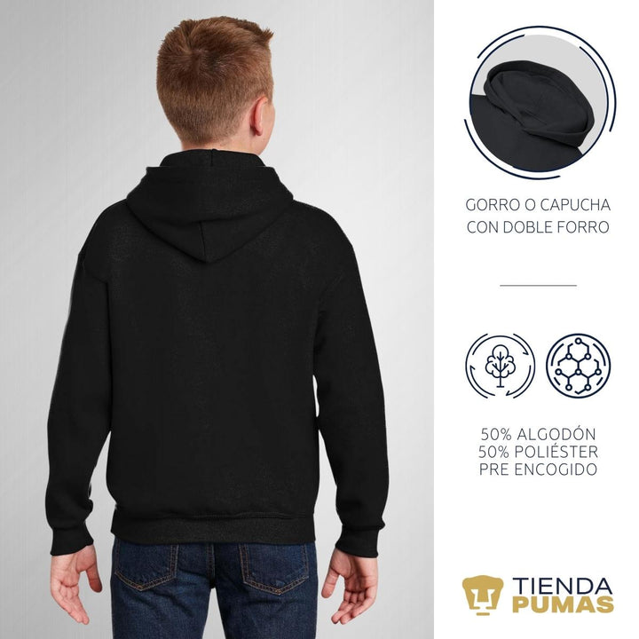 - ORIGINALIDAD Y SOSTENIBILIDAD: Sudadera infantil con capucha. Producto Oficial con un diseño original de Pumas UNAM impreso con tecnología DTG (directo a la prenda) tacto cero. Se utilizan tintas ecológicas sin contaminantes que se adhieren a las fibras de la ropa, garantizando calidad, colores vivos e imagen de larga duración en la sudadera sin comprometer el planeta. La sudadera cuenta con etiqueta y holograma que garantiza un producto 100% original de Pumas UNAM.