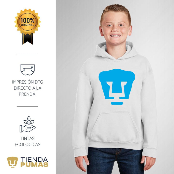 - ORIGINALIDAD Y SOSTENIBILIDAD: Sudadera infantil con capucha. Producto Oficial con un diseño original de Pumas UNAM impreso con tecnología DTG (directo a la prenda) tacto cero. Se utilizan tintas ecológicas sin contaminantes que se adhieren a las fibras de la ropa, garantizando calidad, colores vivos e imagen de larga duración en la sudadera sin comprometer el planeta. La sudadera cuenta con etiqueta y holograma que garantiza un producto 100% original de Pumas UNAM.