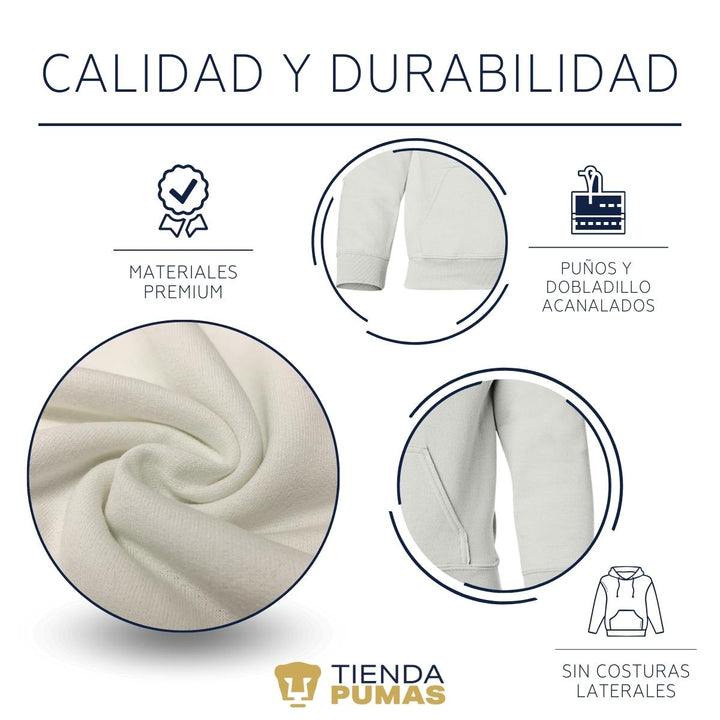 - ORIGINALIDAD Y SOSTENIBILIDAD: Sudadera infantil con capucha. Producto Oficial con un diseño original de Pumas UNAM impreso con tecnología DTG (directo a la prenda) tacto cero. Se utilizan tintas ecológicas sin contaminantes que se adhieren a las fibras de la ropa, garantizando calidad, colores vivos e imagen de larga duración en la sudadera sin comprometer el planeta. La sudadera cuenta con etiqueta y holograma que garantiza un producto 100% original de Pumas UNAM.