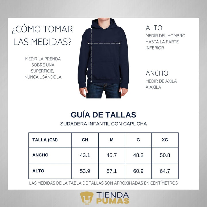 - ORIGINALIDAD Y SOSTENIBILIDAD: Sudadera infantil con capucha. Producto Oficial con un diseño original de Pumas UNAM impreso con tecnología DTG (directo a la prenda) tacto cero. Se utilizan tintas ecológicas sin contaminantes que se adhieren a las fibras de la ropa, garantizando calidad, colores vivos e imagen de larga duración en la sudadera sin comprometer el planeta. La sudadera cuenta con etiqueta y holograma que garantiza un producto 100% original de Pumas UNAM.