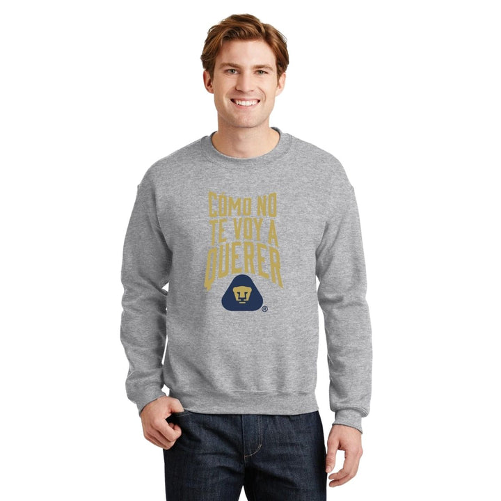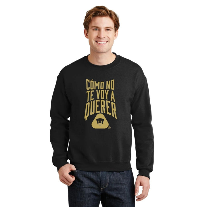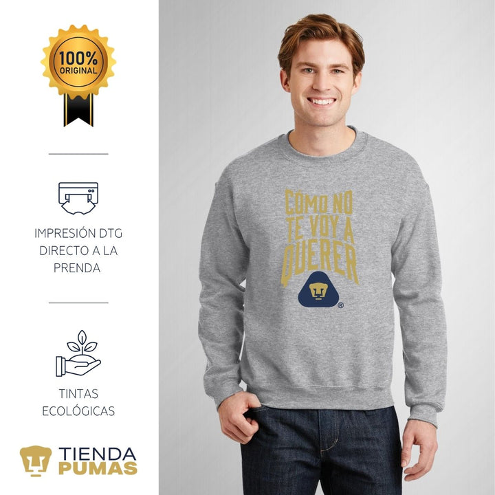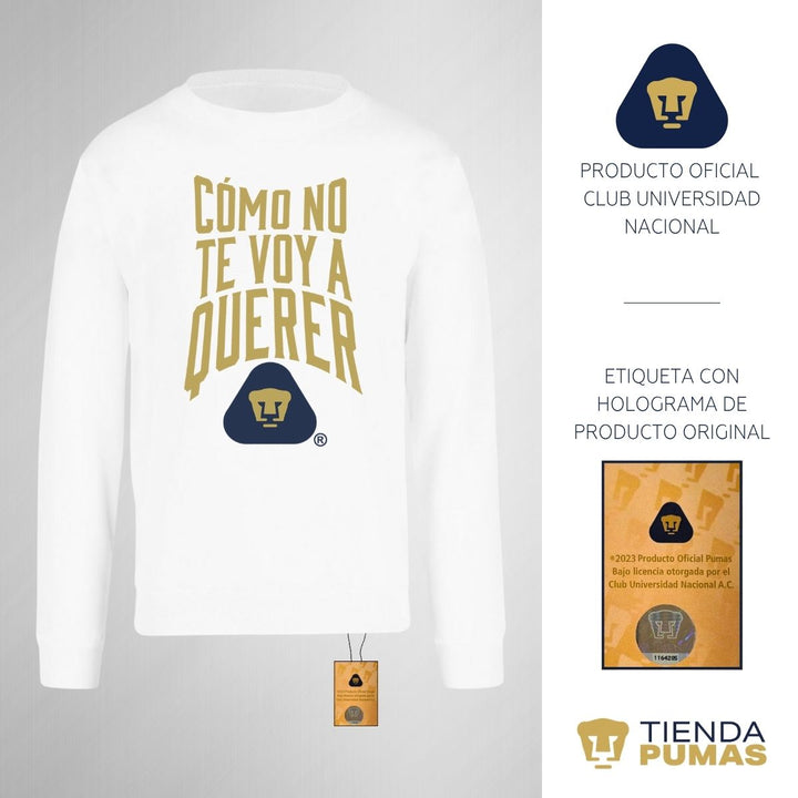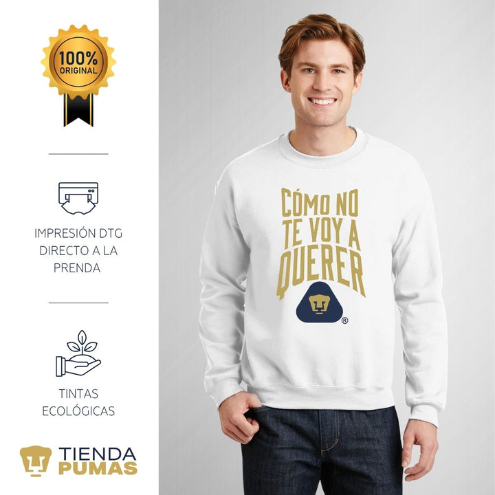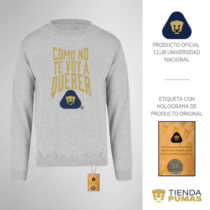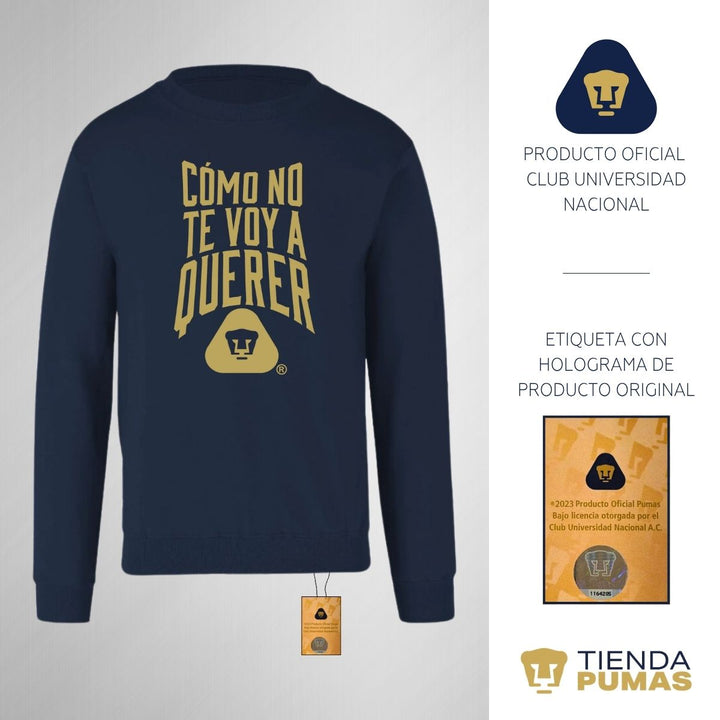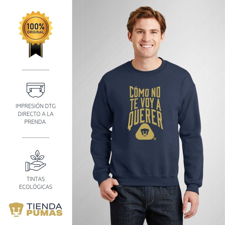 Sudadera de adulto cuello redondo sin gorro o capucha, para hombre o mujer nueva Pumas UNAM oficial, diseño Como No Te Voy A Querer original impreso con tecnología DTG (directo a la prenda) tacto cero, uso casual o deportiva, 50% algodón y 50% poliéster, estructura sin costura en los costados con ajuste clásico. Colores de sudadera: Azul Marino, Blanco, Negro, Gris.